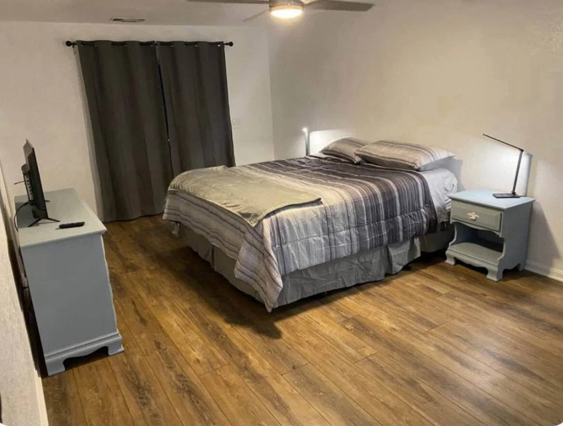 Master bedroom with private bath and sliding glass door to patio, $875 per month